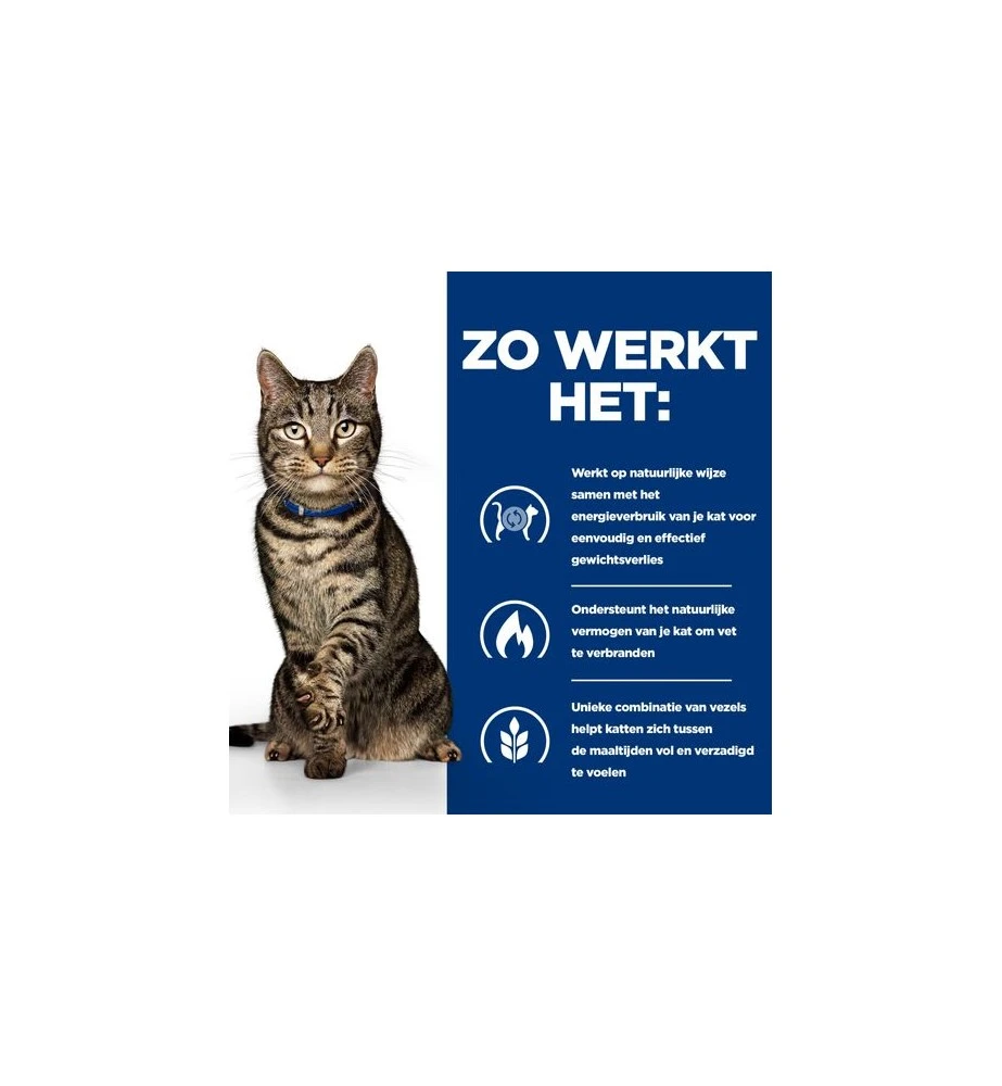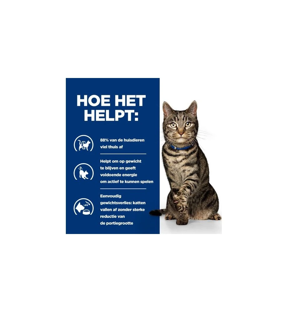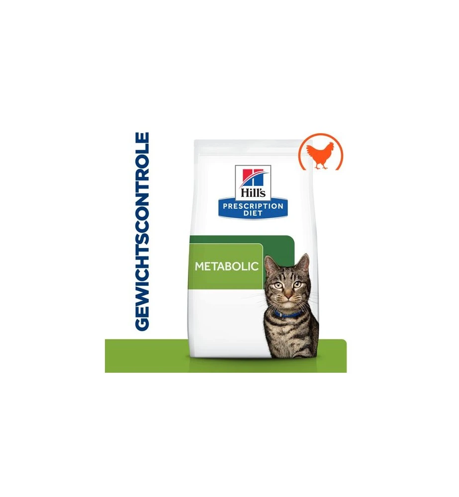 De Hill’s Prescription Diet Metabolic & Weight Management dieetvoeding is een volledige vetarme droogvoeding voor katten die te maken hebben met overgewicht (obesitas). De voeding heeft een stimulerend effect op het natuurlijke vermogen van het lichaam om vet te verbranden. Bij het Hill’s Metabolic & Weight Management dieet is klinisch bewezen dat het binnen 2 maanden zorgt voor een reductie van 11% lichaamsvet.Â